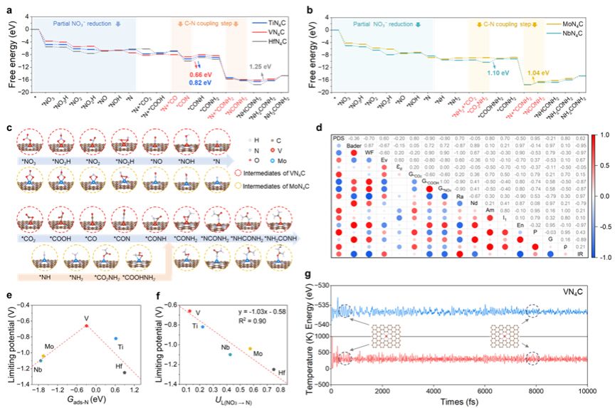 图6.反应路径、结构-性质关系以及热稳定性。a)TiN4C、VN4C、HfN4C和b) MoN4C、NbNC上的尿素生成过程的吉布斯自由能图示。c) 在VN4C和MoN4C上合成尿素的反应中间体的晶格结构。d) VN4C中电子和几何结构特征的相关图。e) 氮原子吸附的吉布斯自由能以及f) *NO转化为*N的UL与尿素合成的UL之间的相关性。g) AIMD中隐式溶剂作用下VN4C的平衡结构的能量和温度波动。