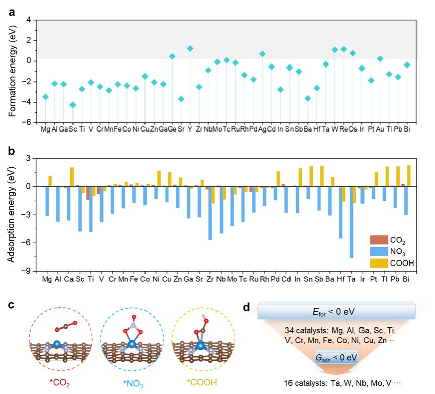 图2. 基于形成能和中间吸附自由能的MN4C催化剂初步筛选。a) MN4C的形成能。b) *CO2、*NO3和*COOH在MNC上的吸附自由能(M= Mg、Al、Ca、Sc、Ti、V、Cr、Mn、Fe、Co、Ni、Cu、Zn、Ga、Ge、Sr、Y、Zr、Nb、Mo、Tc、Ru、Rh、Pd、Ag、Cd、In、Sn、Sb、Ba、Hf、Ta、W、Re、Os、Ir、Pt、Au、Ti、Pb、Bi)。c) *CO2、*NO3、*COOH的晶格结构。d) 基于形成能和吸附自由能的选择条件和s筛选结果。
