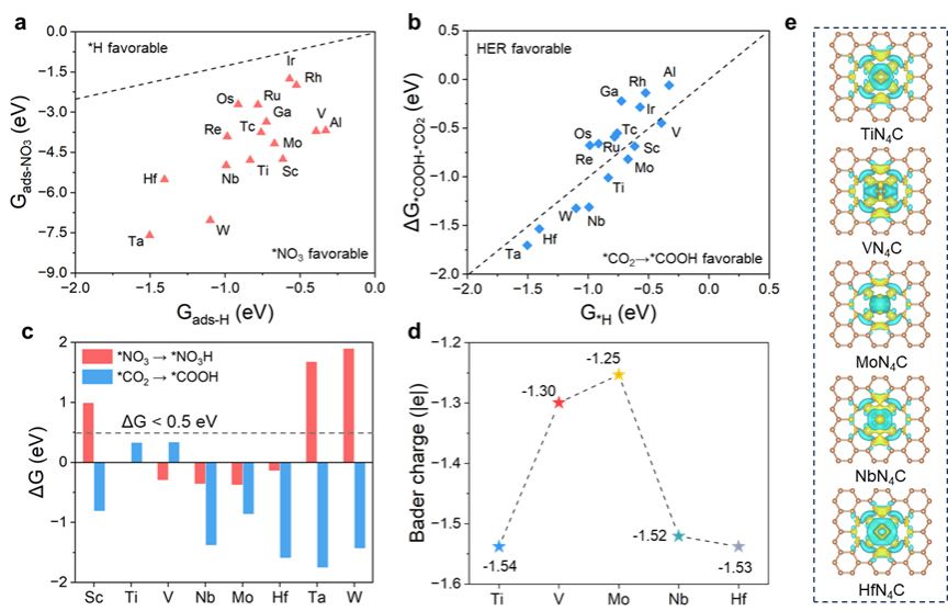 图3. MN4C催化剂的吸附选择性和第一步加氢热力学评价。a) *NO3对*H和b) *COOH对*H的吸附自由能比较。c) NO3和CO2第一步氢化反应的吉布斯自由能变化。d) Bader和e) MN4C中M原子的差分电荷(M=Ti,V,Nb,Mo和Hf)。
