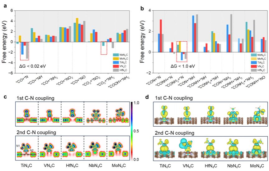 图4. MN4C催化剂上C-N耦合的能垒及电子结构。a)*N、*NH、*NH2、*NO、*NO2与*CO、*CO2、*COOH的耦合能垒对比。b)*N、*NH、*NH2、*NO与*CON、*CONH、*CONH2在MN4C(M=Nb、Mo、Ti、V和 Hf)上的耦合能垒对比。MN4C(M=Nb, Mo, Ti, V, Hf)的c) ELF(电子局域泛函)以及d)两种不同C-N耦合中间体的电荷密度图(第一种为C-N键耦合*CO+*N和*CO2+*NH2,上列;第二种为C-N键耦合*CONH2+*N,下列)。